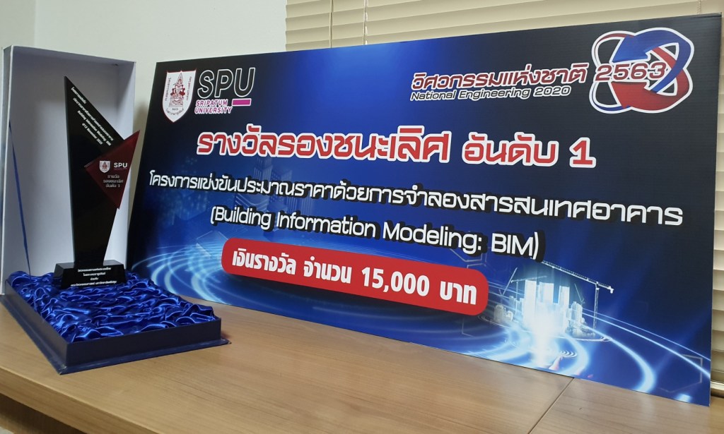 ในโอกาสคว้ารางวัลรองชนะเลิศอันดับ 1 รับเงินรางวัลทุนการศึกษา 15,000 บาท พร้อมโล่รางวัลและประกาศนียบัตร จากการเข้าร่วมโครงการแข่งขันประมาณราคาด้วยการจำลองสารสนเทศอาคาร (Building Information Modeling: BIM) ในงานวิศวกรรมแห่งชาติ 2563 ณ ห้องประชุมแซฟไฟร์ ฮอล 9 อิมแพ็ค ฟอรั่ม เมืองทองธานี จ.นนทบุรี เมื่อเร็วๆนี้