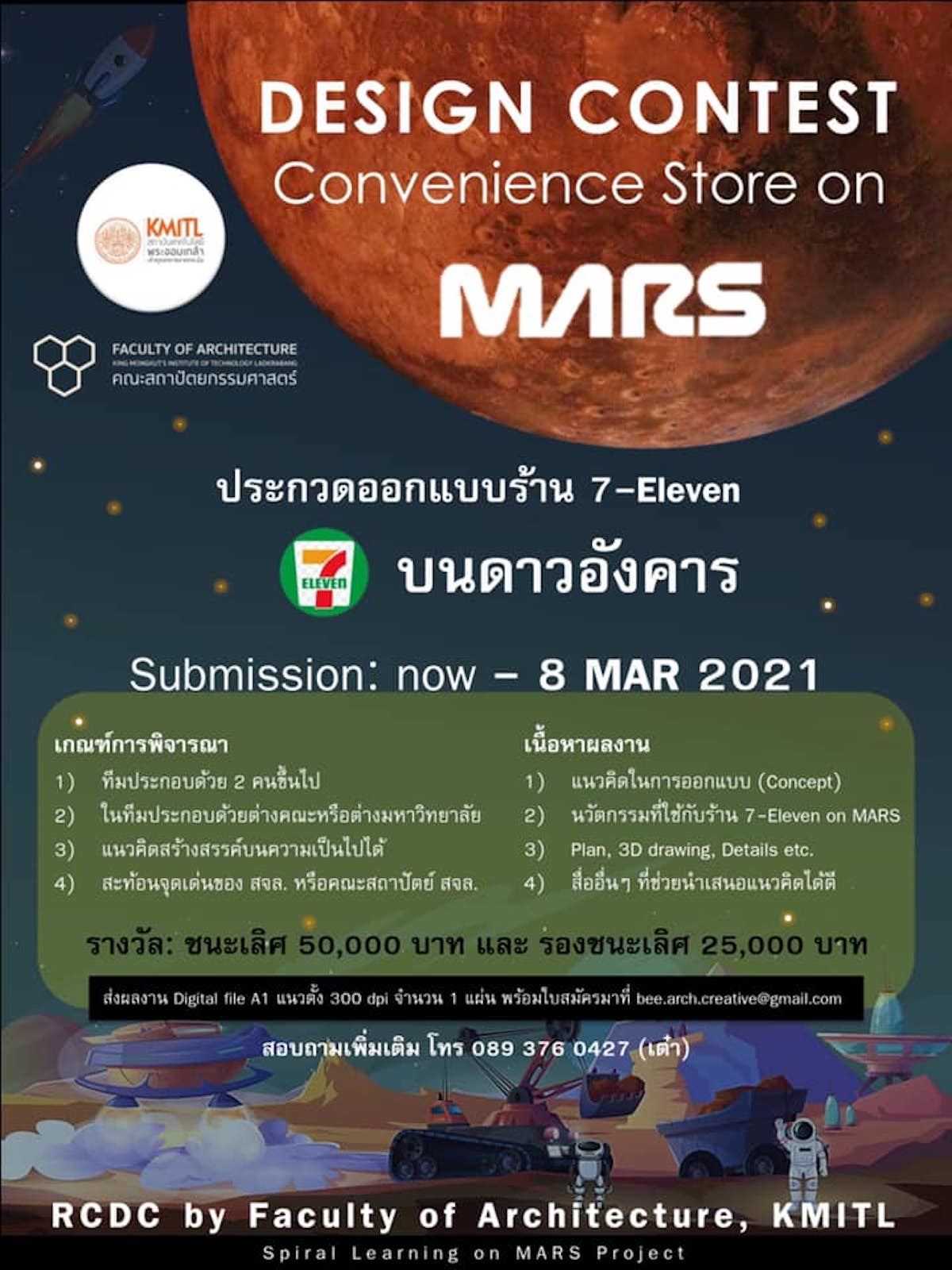 ขอเชิญนักศึกษาสาขาสถาปัตยกรรม ออกแบบ และ ศิลปกรรม ส่งผลงานสร้างสรรค์ ร่วมประกวดออกแบบร้านสะดวกซื้อ 7 -Eleven on MARS หรือ ร้านสะดวกซื้อบนดาวอังคาร